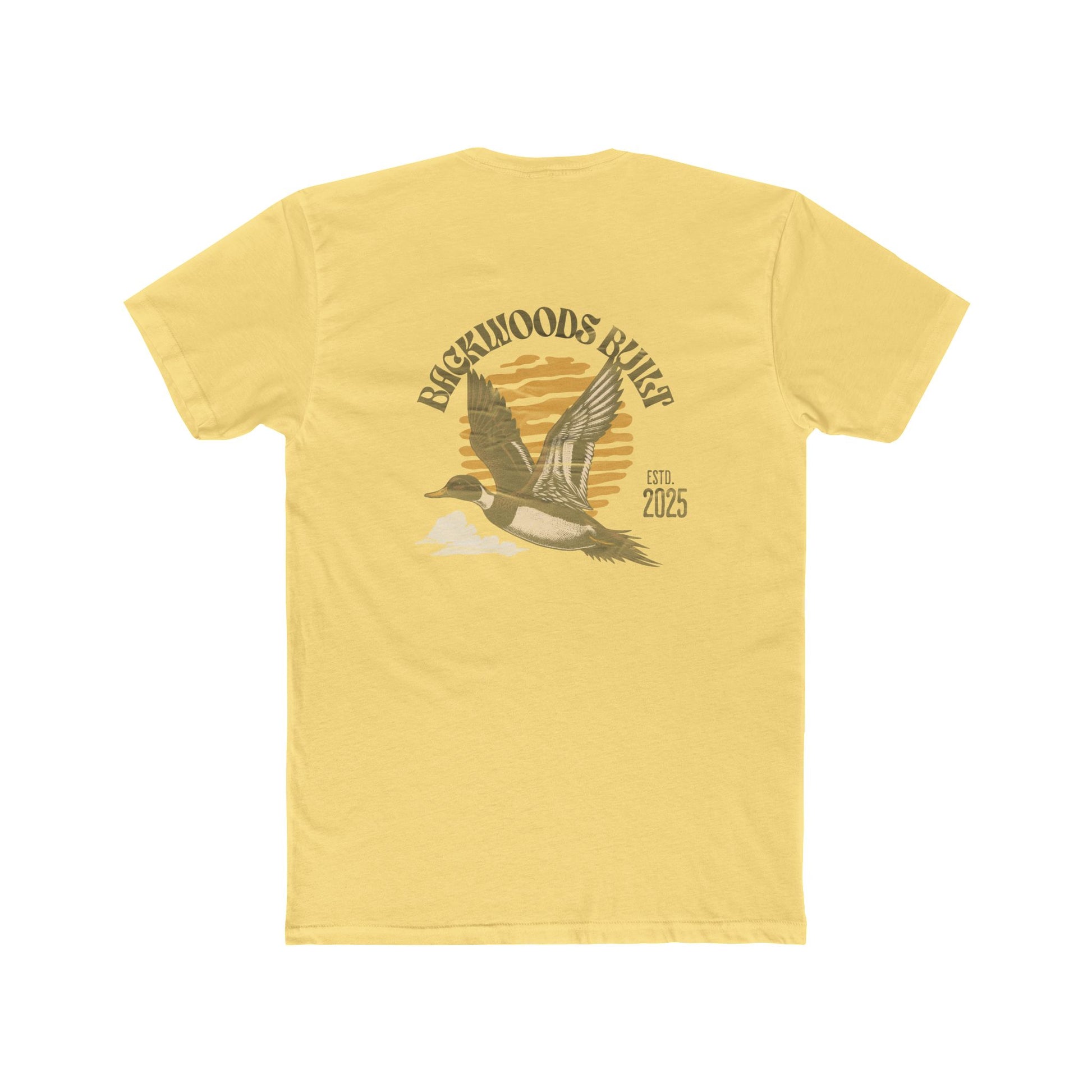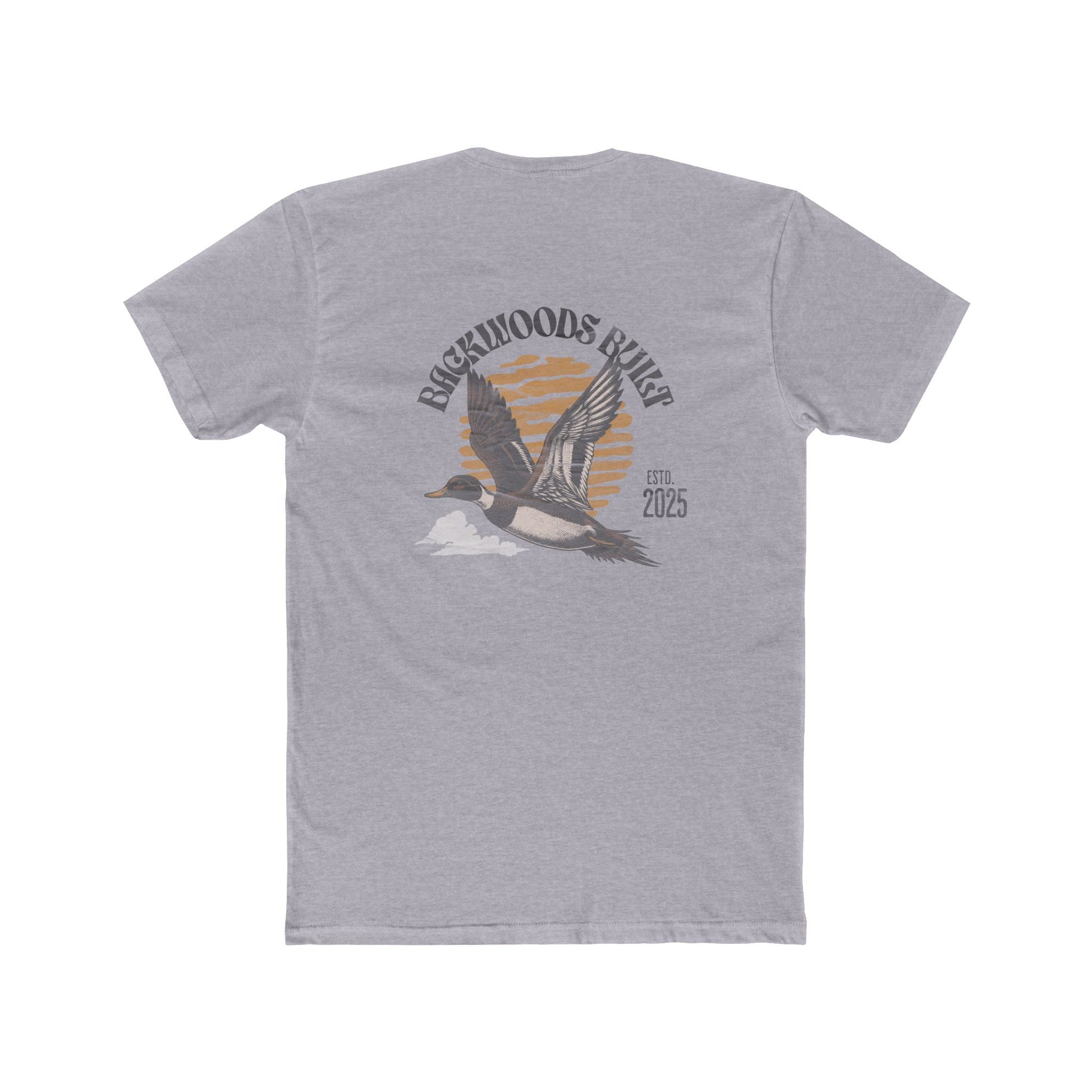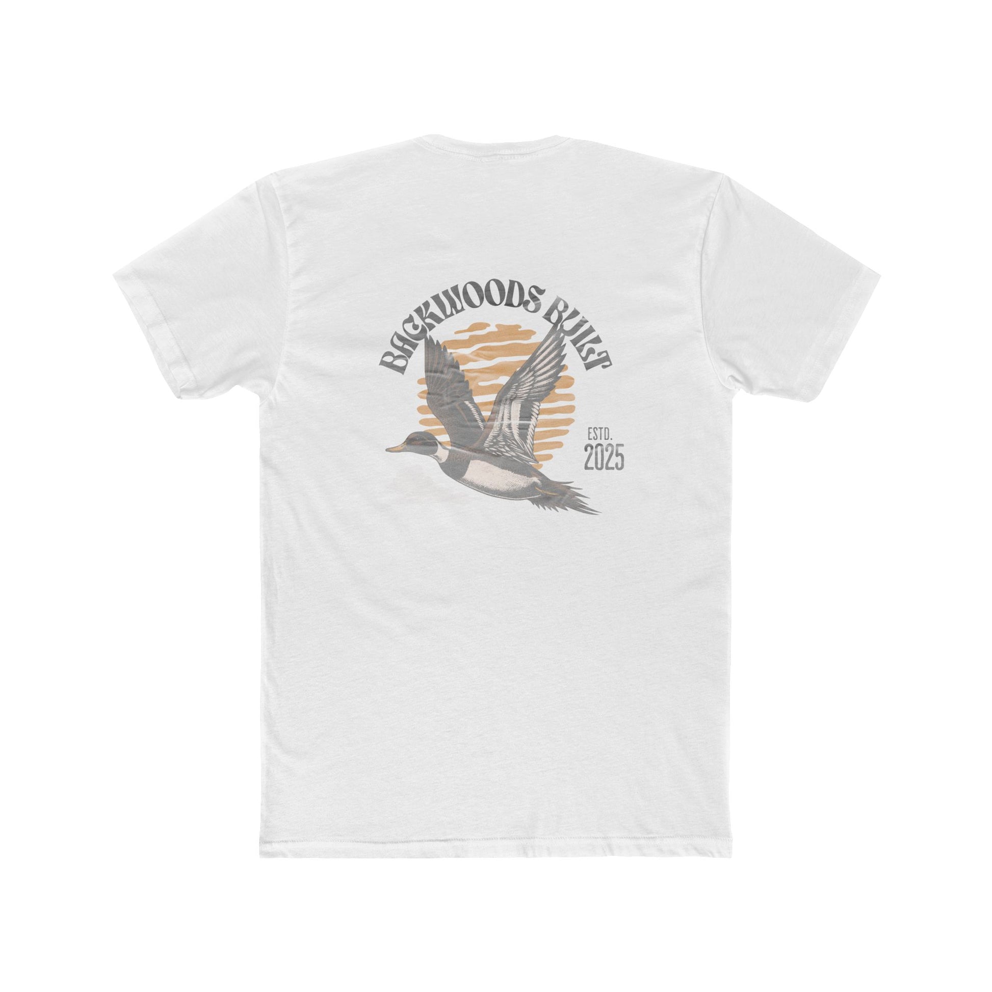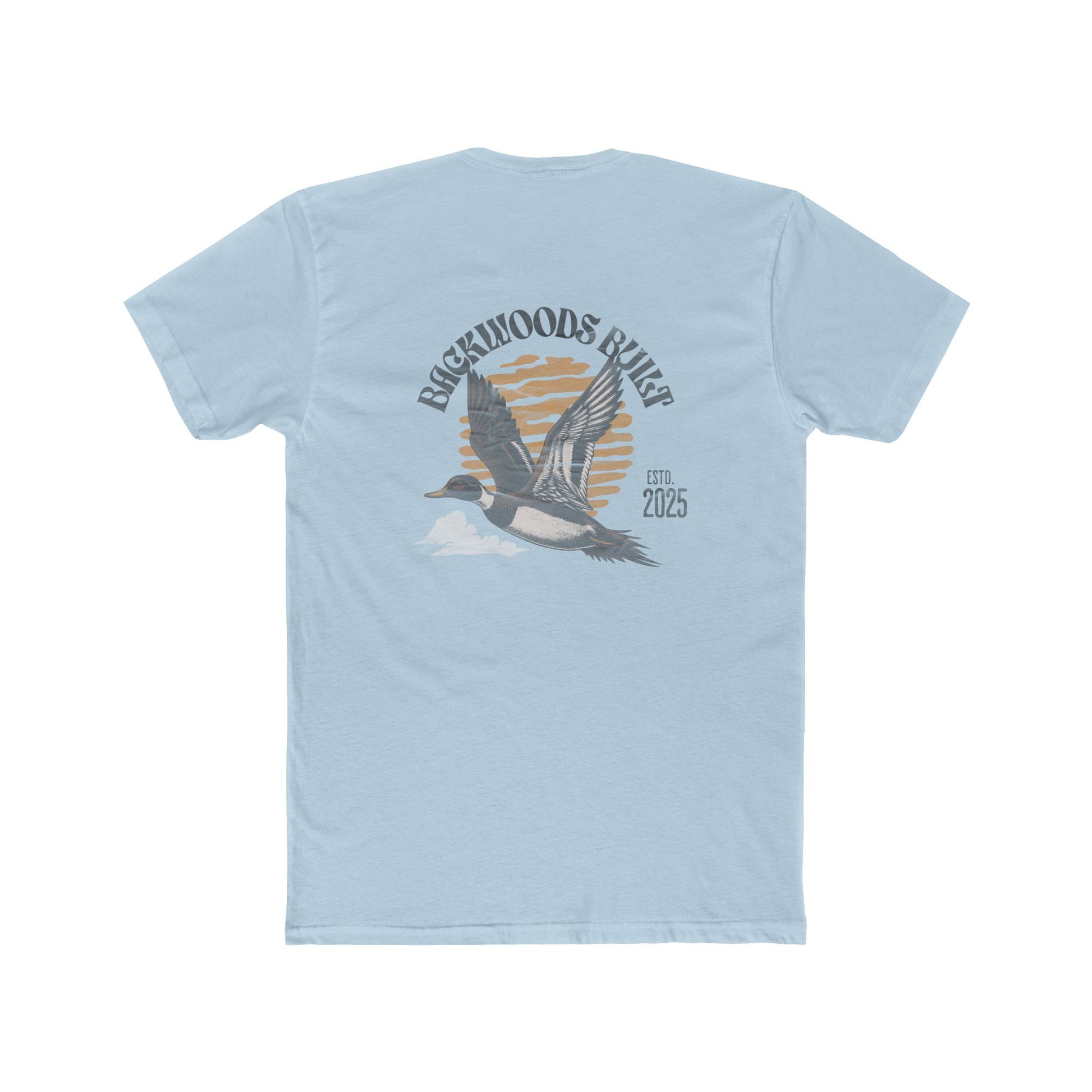 Light and airy, this cotton crew brings a quiet, lakeside morning to your everyday rotation. The front chest carries a small, hand-etched emblem while the back opens into a vintage-inspired scene: a pair of loons gliding before a muted sun, framed by the curved name of a lakeside refuge. Soft to the touch and subtly worn-in in appearance, the tee layers easily under flannels or stands on its own with rolled sleeves. It’s for slow drives to the water, for evenings around a chipped mug, and for anyone who wants an understated nod to waterfowl and shoreline memories.